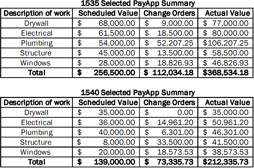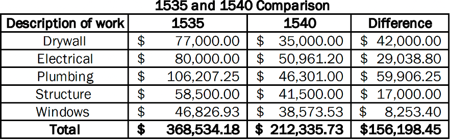 The five highest-cost categories for Building 1535 were drywall, electrical, plumbing, structural work, and windows. Plumbing costs nearly doubled, and window costs increased by more than 50% compared to the original contract. Building 1540 was the first to be completed, and the same five categories cost $156,198.45 less than in 1535 (see details below). This represents a 74% increase in costs for 1535 compared to 1540.